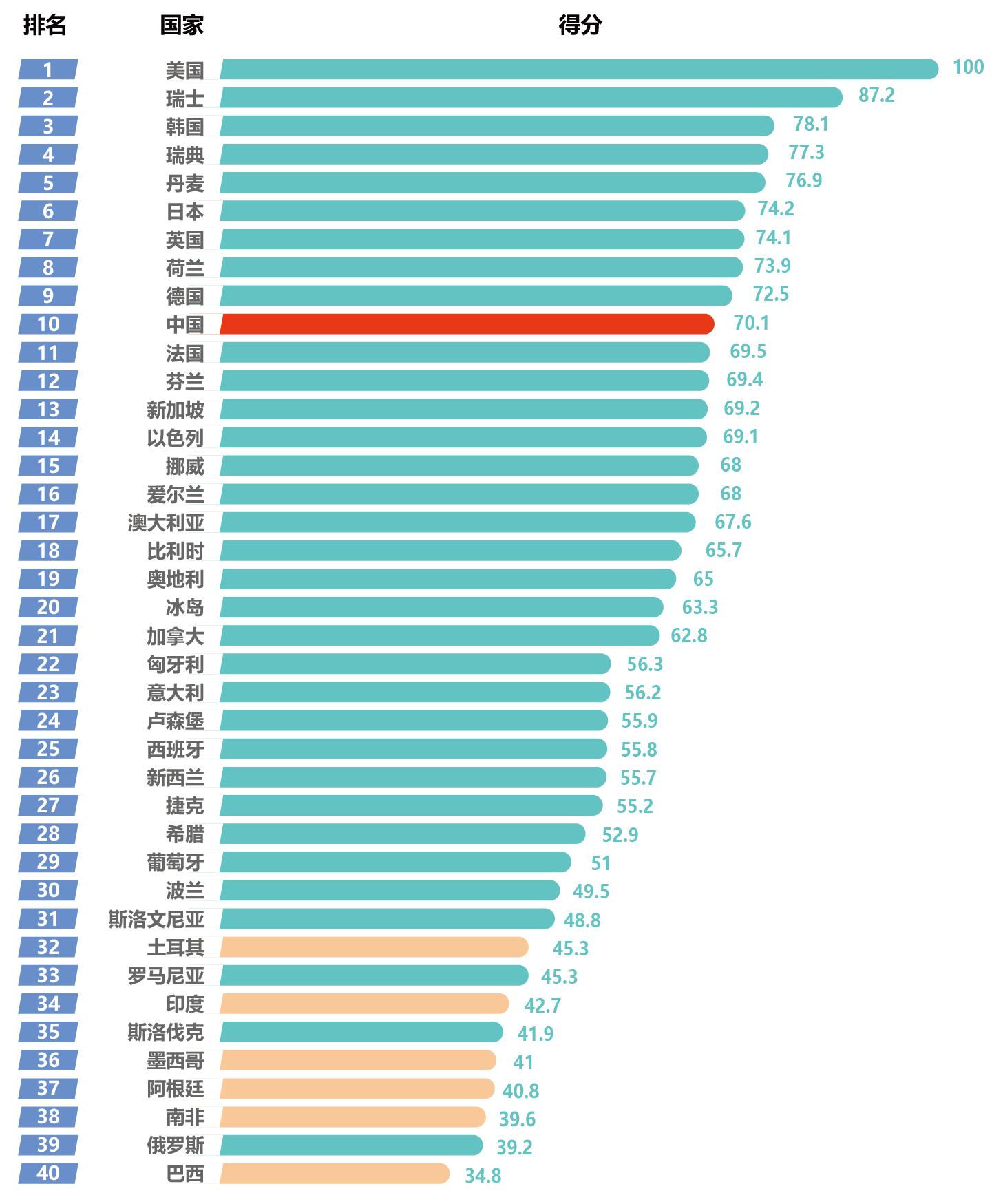 从具体得分看,中国国度立异指数得分为70。1分,跨越法国,次要目标增速高于发财国度程度。总体来看,中国立异能力接近人均P正在5万美元摆布的欧洲国度,且仍处于稳步上升的通道。从国度立异指数5个分指数来看,中国正在各个维度均有不俗表示,“立异资本”“学问创制”表示凸起,为科技强国扶植奠基根本。(1)“立异资本”排名第5位。2022年,中国研发经费投入占全球的20。1%,稳居世界第2位,相当于美国R&D经费投入的49。5%;R&D/P达到2。49%(2024年提拔至2。68%),排名第14位;根本研究经费占全社会研发经费收入比沉为6。57%(2024年提拔至6。91%),排名第34位。天然指数上榜的顶尖科研机构数量排名世界第2位;QS世界大学排名本国TOP3高校平均得分排名第4位。STEM结业生数量占结业生总数比沉居世界首位;R&D人员总量继续位居世界首位;高被引科学家人数稳居世界第2位。(2)“学问创制”排名第7位。中国高被引论文数占世界份额大幅提拔,排名连结世界第1位,高被引论文占本国论文数量比沉为1。1%,排名第26位。中国无效发现专利数量达到335。1万件,位居世界首位;每万就业人员发现专利具有量排名第8位。亿美元工业添加值工业设想注册申请量排名第1位。(3)“企业立异”排名第9位。中国三方专利数量占全球总量的比沉快速提高,达到10。4%,PCT专利数量(进入国度阶段)达到3。8万件,均排名世界第3位。企业研发经费取工业添加值之比、企业研究人员占全社会研究人员比沉别离排名第18位和第16位;本国R&D经费前十的企业平均投入强度为5。5%,排名第17位。学问产权力用费收入占办事业出口商业比沉排名第20位。高手艺财产出口额占世界比沉为22。3%,排名第1位;高手艺和中高手艺财产添加值占制制业添加值比沉排名第24位;学问稠密型办事业添加值占办事业添加值比沉排名第26位。劳动出产率和单元能耗经济产出排名第38位和第34位;单元CO2排放经济产出排名第37位。(5)“立异”排名第20位。中国“创业文化”得分排名第2位;“企业取大学研究取成长协做程度”排名第5位;“风险本钱可获得性”排名第8位;“营商的政策”和“正在线位;“消息化成长程度”排名第20位;“国际投资额取P的比值”排名第29位;“”排名第34位。